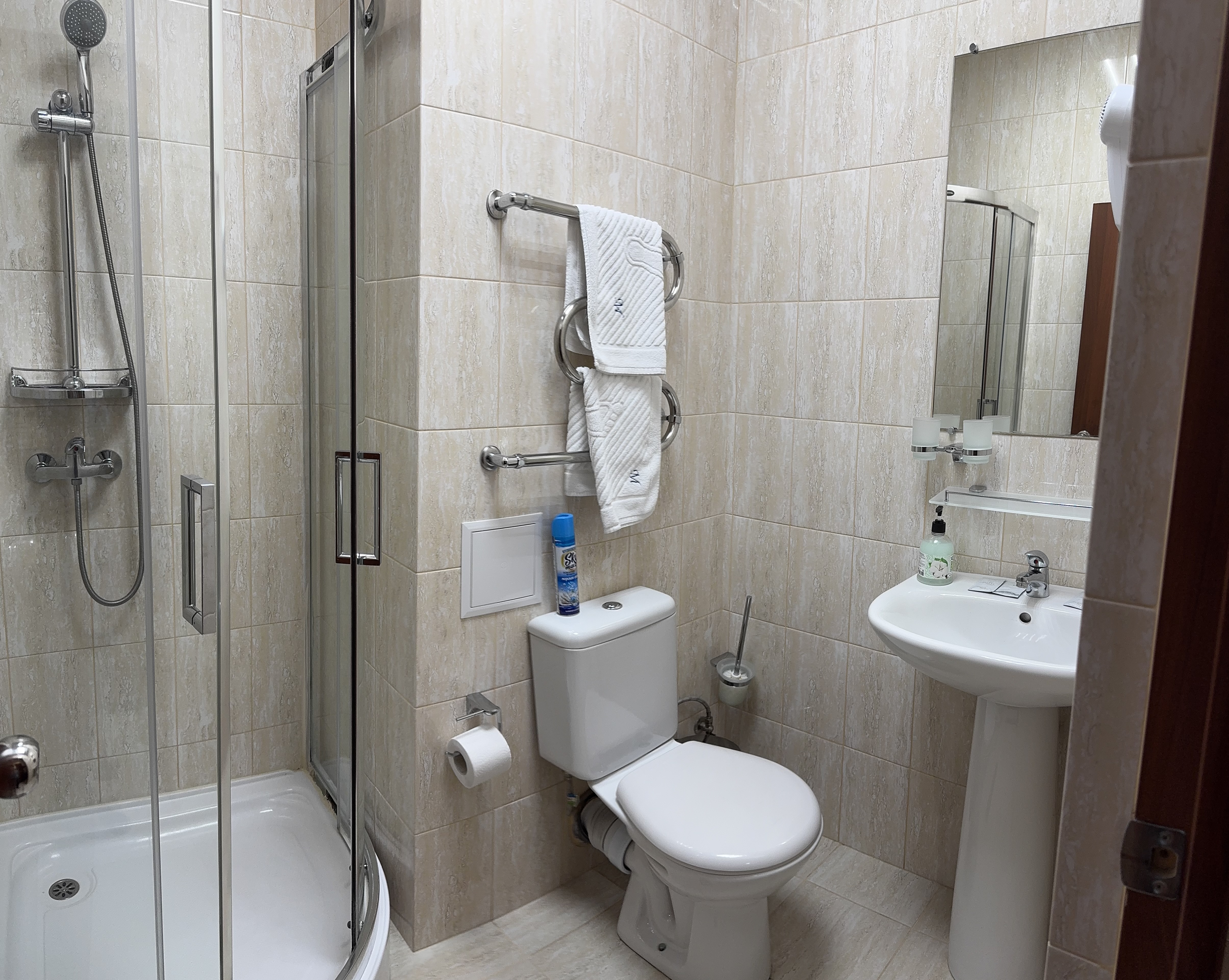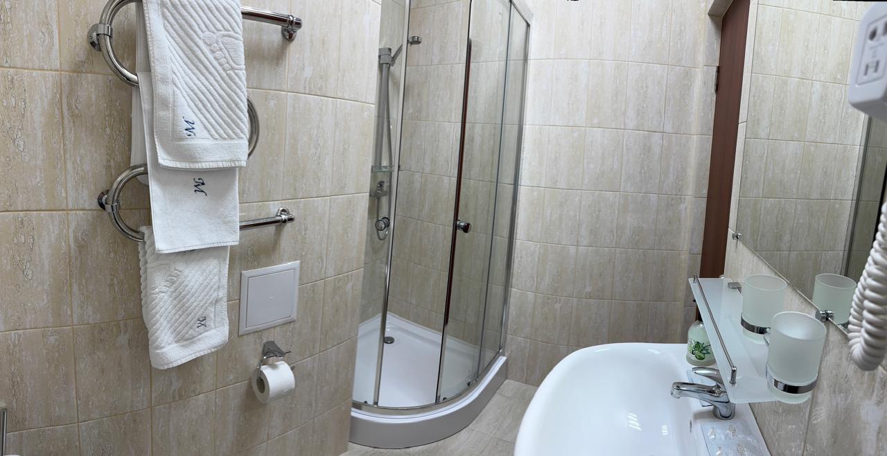 Ванная комната: собственный санузел, душевая кабина, фен, набор полотенец, тапочки, туалетно-косметические принадлежности.