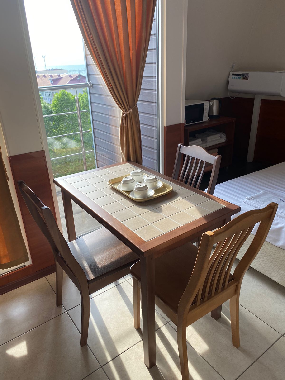 Оснащение номера и мебель: кондиционирование/система климат-контроля, телефон, утюг, шкаф/гардероб, балкон.