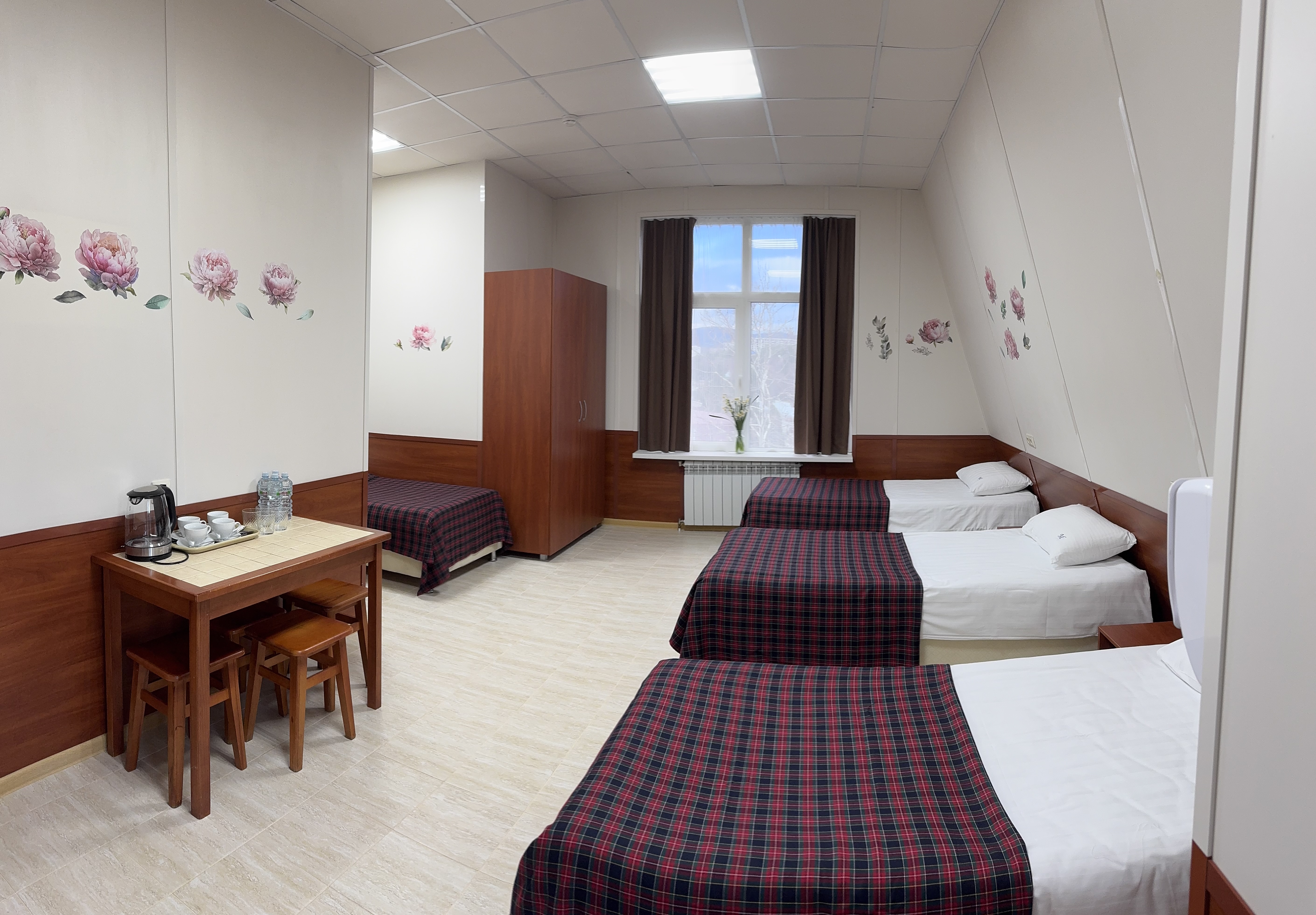 Оснащение номера и мебель: четыре раздельные кровати, кондиционирование/система климат-контроля, шкаф, тумба, балкон, утюг на этаже.